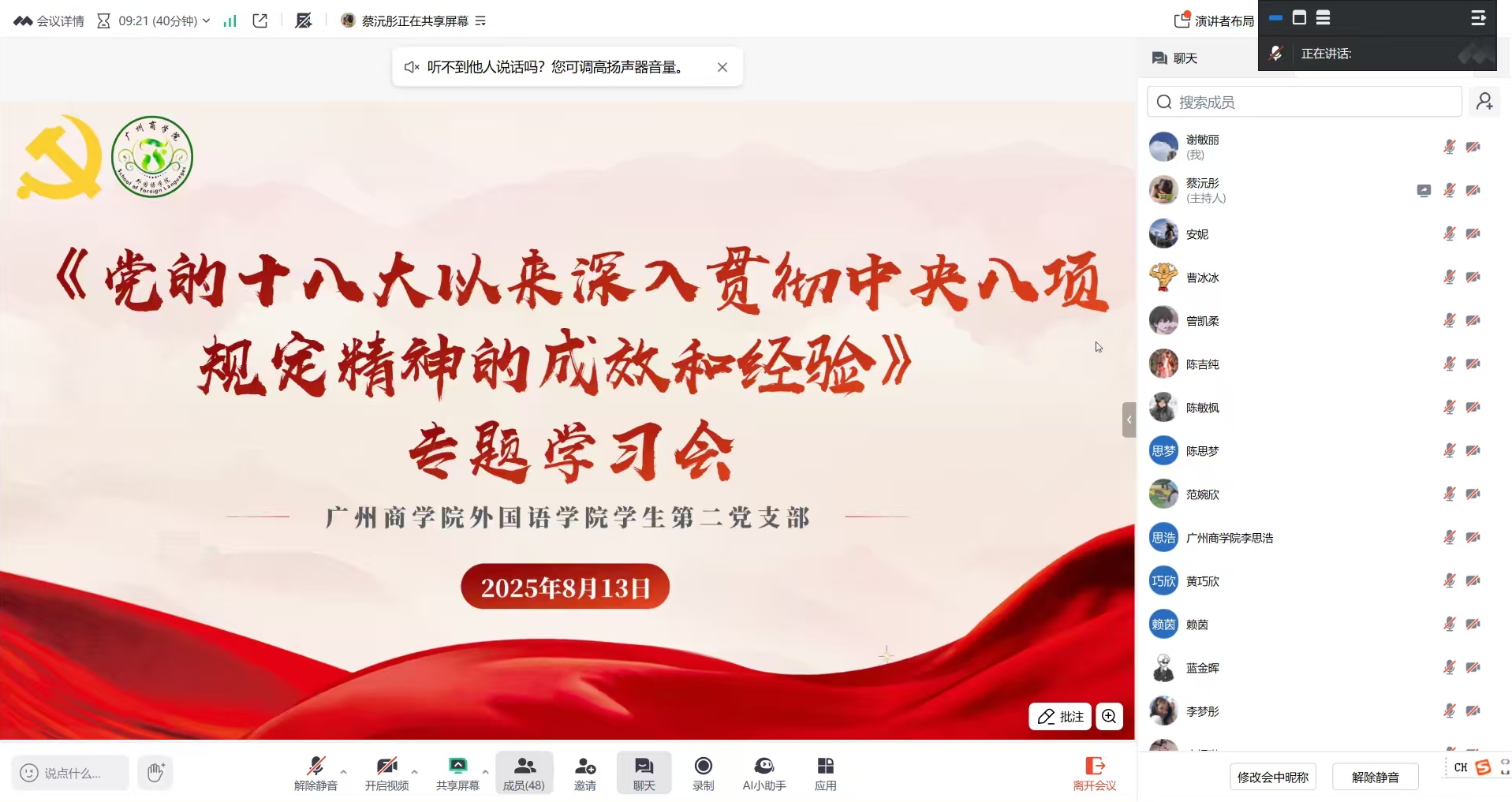 为扎实推进深入贯彻中央八项规定精神学习教育,持续强化党员对中央八项规定精神的理解与落实,进一步增强廉洁自律意识,永利yl23411学生第二党支部于8月13日在腾讯会议召开党的十八大以来深入贯彻中央八项规定精神的成效和经验专题学习会。本次会议由学生党员蔡沅彤主持,学生第二党支部全体党员参会。