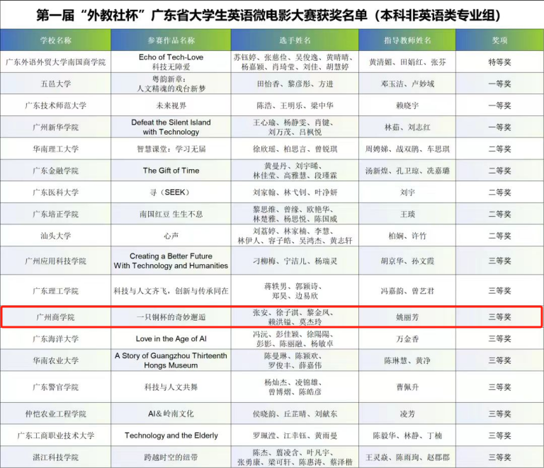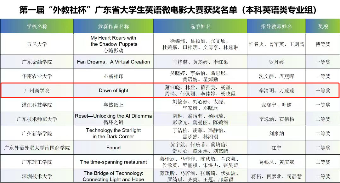 永利yl23411萧钰晓、林盈、赖雅雯、杨盈、周琦、何佩珊、李佳婷和杨晓霞8位同学,在永利yl23411商务英语专任教师李清玥、万臻臻的悉心指导下,以其作品《Dawn of Light》荣获本科英语类专业组一等奖及最佳制作奖。该作品以细腻的叙事和出色的制作,充分体现了外院学子的卓越才华与创新精神。同时,由永利yl23411大学英语专任教师姚丽芳指导,张安、徐子淇、黎金凤、赖洪镒、莫杰玲5位同学共同完成的作品《一只铜杯的奇妙邂逅》荣获本科非英语类专业组三等奖。该作品以独特的视角讲述了普通物件与人类情感之间的联系,展现了非英语专业学生在英语应用和跨文化交流方面的潜力与创意。