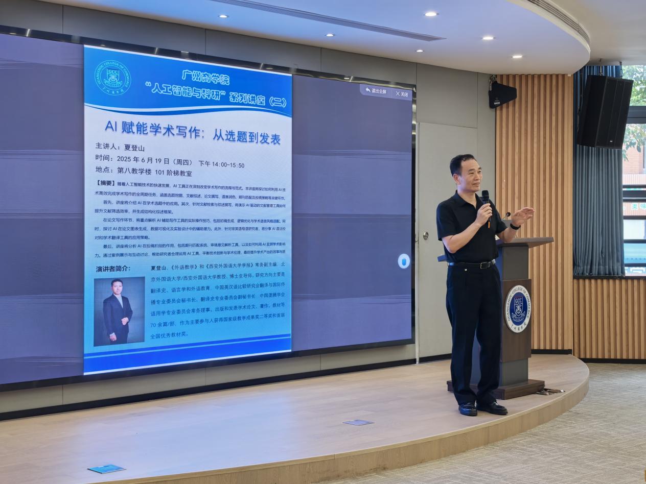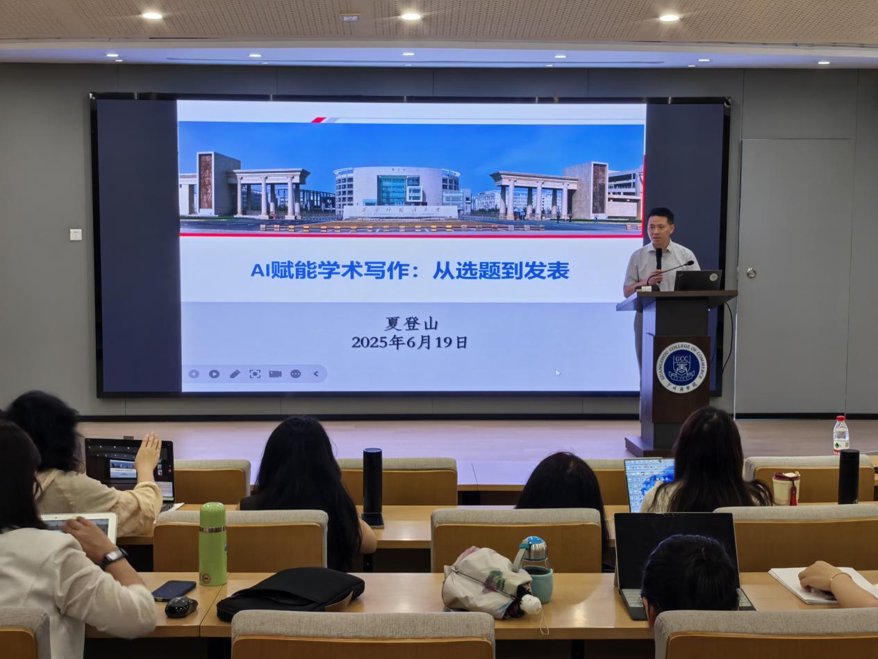 6月19日,永利yl23411,永利yl23411在第八教学楼101报告厅成功举办“AI 赋能学术写作:从选题到发表”主题讲座。本次讲座由外语学科带头人莫爱屏教授主持,北京外国语大学、西安外国语大学教授、博士生导师夏登山教授主讲,永利yl23411和国际学院全体教师齐聚一堂,共同探索人工智能技术如何深度革新学术写作全流程。