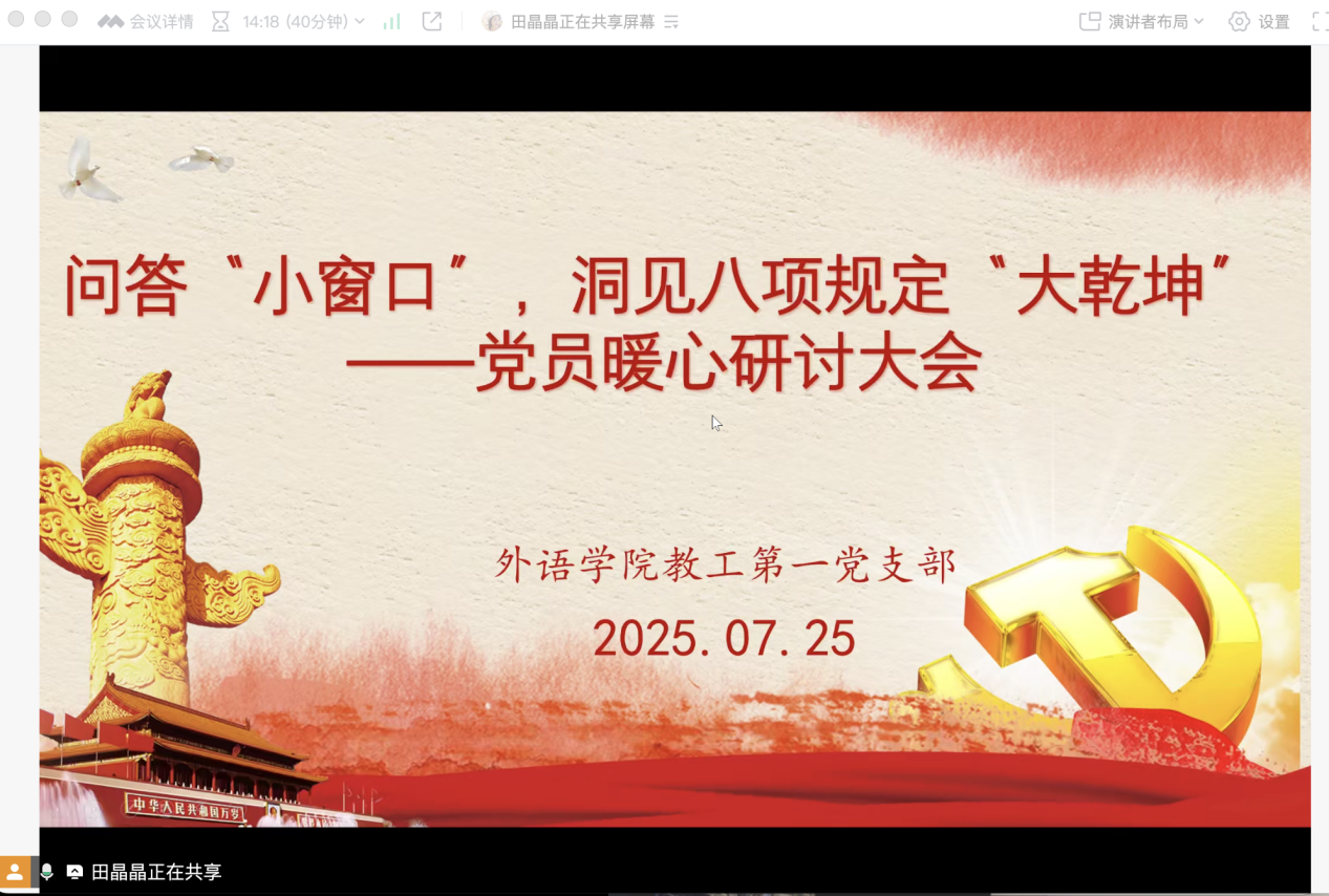 7月25日晚,永利yl23411教工第一党支部通过腾讯会议平台开展暑期党日活动,围绕“深入贯彻中央八项规定精神学习教育”主题展开专题学习与交流。本次会议由党支部书记田晶晶主持,支部全体党员参加会议。
