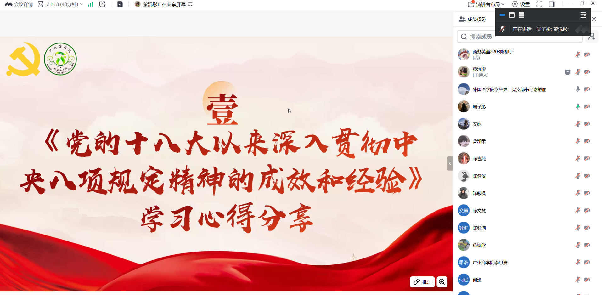 为扎实推进深入贯彻中央八项规定精神学习教育,持续强化党员对中央八项规定精神的理解与落实,进一步增强廉洁自律意识,永利yl23411学生第二党支部于8月13日在腾讯会议召开党的十八大以来深入贯彻中央八项规定精神的成效和经验专题学习会。本次会议由学生党员蔡沅彤主持,学生第二党支部全体党员参会。